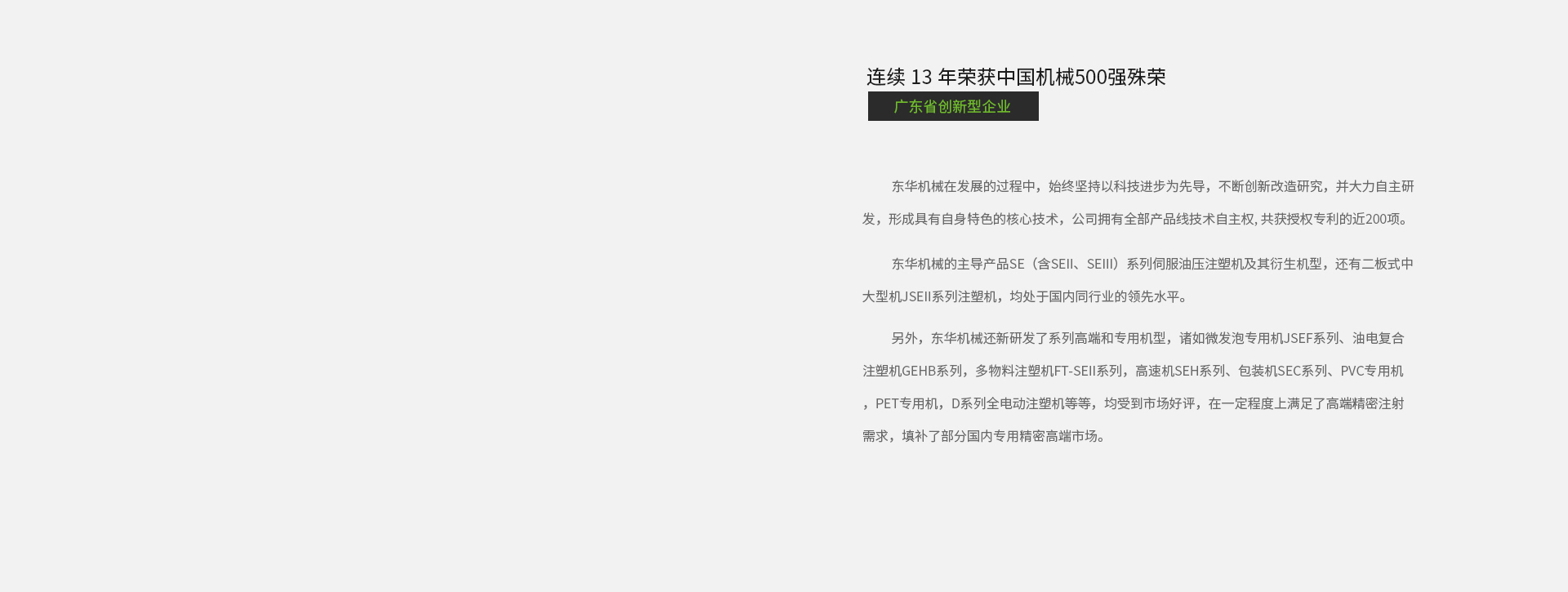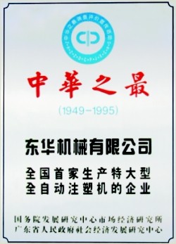 1993年?yáng)|華公司在國(guó)內(nèi)首先突破特大型注塑機(jī)的設(shè)計(jì)和工藝技術(shù),成功設(shè)計(jì)制造出國(guó)內(nèi)首臺(tái)2500噸合模力的TTI-2500B特大型注塑機(jī),填補(bǔ)了我國(guó)大型注塑機(jī)的空白,獲得了國(guó)務(wù)院頒發(fā)的“中華之最”榮譽(yù)證書;同年在國(guó)內(nèi)塑機(jī)行業(yè)首家獲得高新技術(shù)企業(yè)認(rèn)定證書和ISO9001質(zhì)量體系認(rèn)證證書; 2001年研制出國(guó)內(nèi)第一臺(tái)環(huán)保節(jié)能高效的電動(dòng)注塑機(jī);2004年,被廣東省科技廳評(píng)為優(yōu)秀高新技術(shù)企業(yè)。