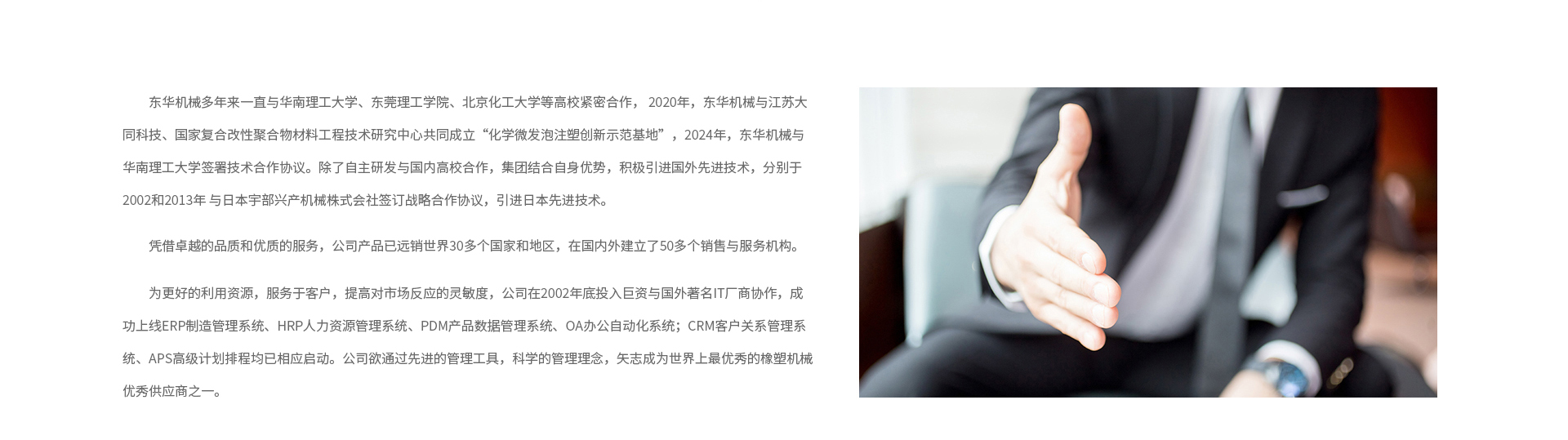 東華機(jī)械有限公司是大同機(jī)械有限公司(港股上市企業(yè))旗下核心子公司,1986年成立,主營(yíng)全自動(dòng)注塑機(jī)及其附屬設(shè)備的生產(chǎn),公司占地面積約20萬平方米,員工近1000人。公司以產(chǎn)品規(guī)格齊全著稱國(guó)內(nèi)同行,以專業(yè)生產(chǎn)特大型注塑機(jī)稱雄塑機(jī)行業(yè),以技術(shù)與產(chǎn)品創(chuàng)新引領(lǐng)國(guó)內(nèi)產(chǎn)品發(fā)展,目前公司在華南和華東地區(qū)設(shè)有注塑機(jī)生產(chǎn)基地,是我國(guó)目前最大型的塑料機(jī)械生產(chǎn)基地之一。公司配備了一整套先進(jìn)完備的設(shè)計(jì)、生產(chǎn)、加工、裝配及檢測(cè)設(shè)備,擁有各類金屬切削設(shè)備100多臺(tái),(其中數(shù)控加工設(shè)備近80臺(tái))。公司可一次性提供全套注塑機(jī)及其配套設(shè)備,注塑量從43g到300,000g,合模力從25噸至4500噸,共有90多個(gè)規(guī)格、百余種款式,年產(chǎn)能力達(dá)5千臺(tái)以上。